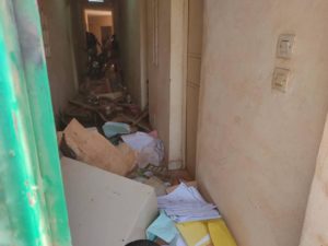 Les manifestants sont à l’intérieur du bâtiment. Les portes et fenêtres sont cabossées, des documents administratifs et des mobiliers sont vandalisés.