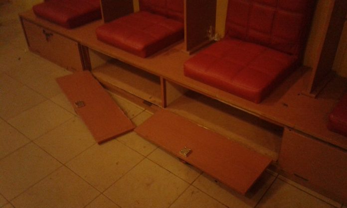 Au total 6 placards se trouvant sous les sièges des joueurs où le matériel sportif peut être rangé ont été saccagés par les joueurs d’Al Nasr. C’est après leur départ du stade que le gardien des lieux a fait le constat de ces casses et a alerté les membres fédéraux et la presse.