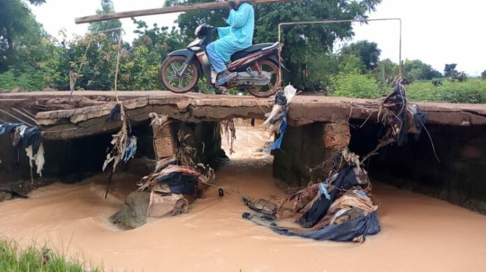 Au niveau du village de Zanfara vers 15h, la famille s’est trouvée devant un pont de fortune, inondé d’eau ce jour.