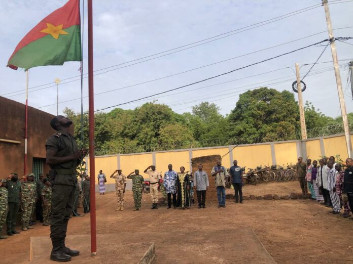 « Selon l’arrêté du Grand Chancelier des Ordres Burkinabé de 2018 à son article 6, l’assistance doit s’arrêter les bras tendus et collés au corps ; les pieds joints ; le regard orienté sur le pavillon (drapeau) », a expliqué la haut-commissaire du Ioba.